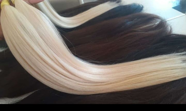 Cabelo Brasileiro loiro descolorido.Totalmente humano e sem misturas quimicas Ate 90 % de fios iguais Cabelo Brasileiro de exelente qualidade,100 gramas em volta por elástico.